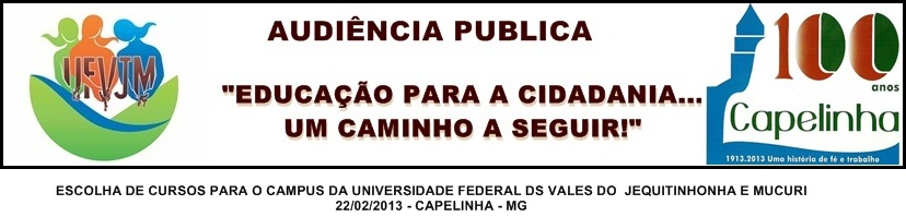 Nesse contexto a Movimento “A UFVJM é nossa! – Capelinha” convida a comunidade de Capelinha e região em Geral para a Audiência Pública que tratará da escolha da área disciplinar e cursos que serão oferecidos no campus da Universidade Federal dos Vales do Jequitinhonha e Mucuri no nosso município.