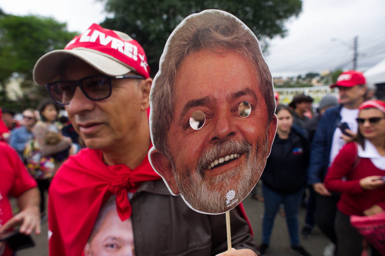 Em uníssono, quase em transe, entoam cânticos e agitam bandeiras direcionados ao que parece ser o Templo da Virtude da República de Curitiba, a sede da Polícia Federal, onde Ele está trancafiado numa sala de 3 por 5, com TV.